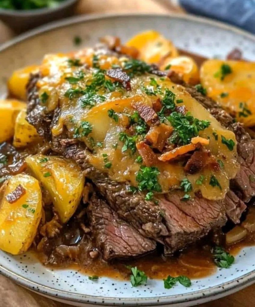 A hearty, flavor-packed comfort meal made right in your slow cooker β tender beef, creamy potatoes, melted cheese, and crispy bacon all in one cozy dish!