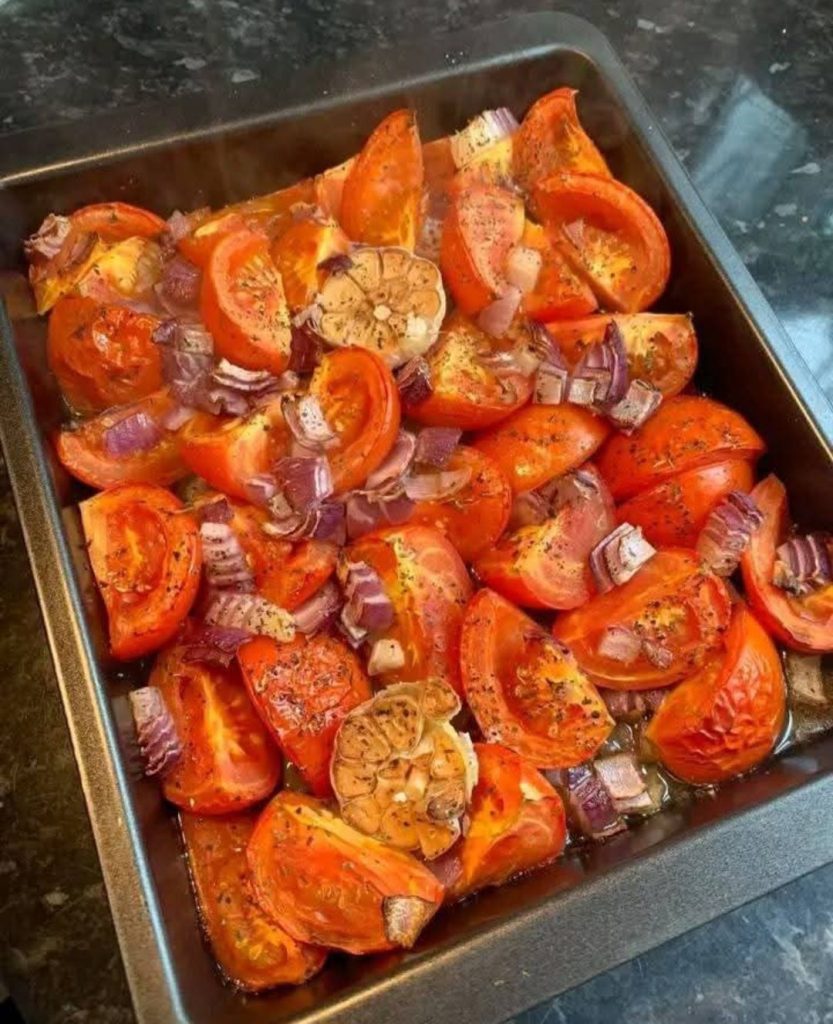 π Place tomatoes, halved garlic bulb, and diced red onion on a baking tray.
